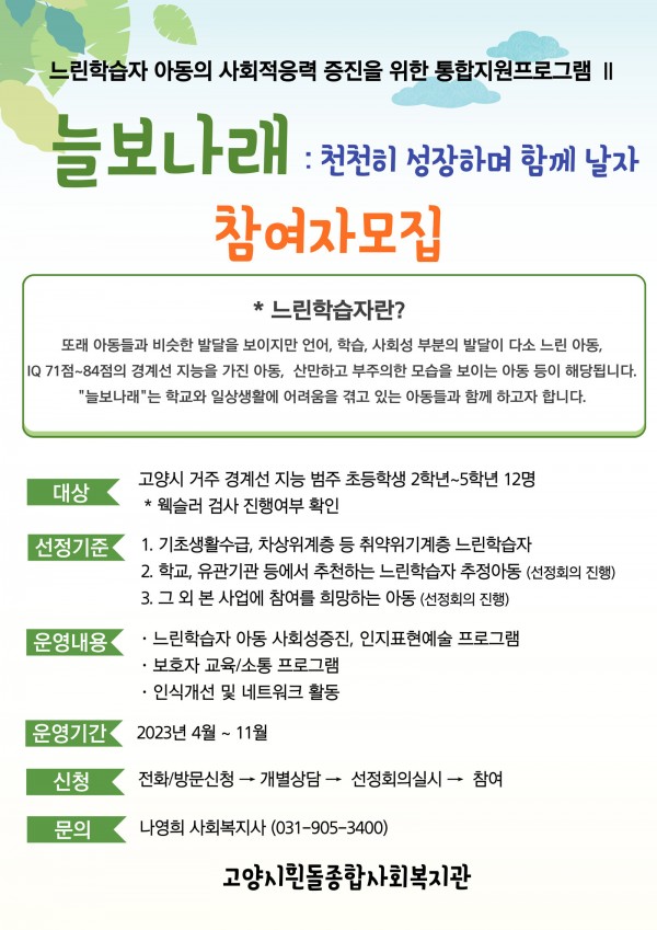 느린학습자 아동의 사회적응력 증진을 위한 통합지원프로그램Ⅱ '늘보나래' 참여자 모집