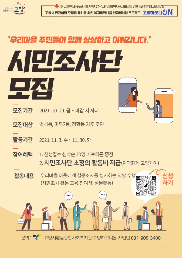4. 내용: 백석동, 마두2동, 장항동에 거주하는 이웃에게 설문조사 실시(시민조사단 1인 25명 이상)