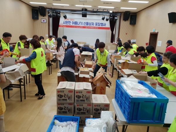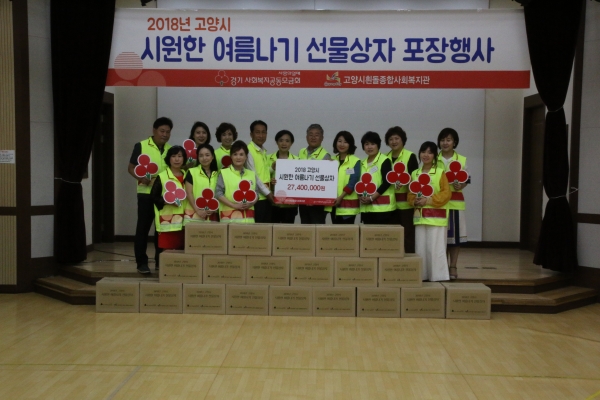 “시원한 여름나기” 사업은 경기사회복지공동모금회 지원으로 입맛 없는 무더운 여름 건강하게 보내시라고 본 복지관 경로식당을 이용하시는 어르신 200명에게 갈비탕과 과일, 떡, 전 등 푸짐한 특별식을 지원해 드렸고, 여름철에 필요한 생활용품과 식료품이 들어 있는 선물상자는 고양시 지역 310세대 저소득층에게 본 복지관과 고양시 푸드뱅크를 통해 전달되었습니다. 선물상자 안에는 여름이불, 쿨토시, 살충제, 제습제와 스팸세트, 국수, 라면, 비타민음료, 참치 및 장조림 캔 등 총 11개 품목의 여름용품과 식료품이 들어 있었습니다.