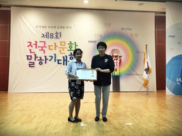 한국어교실'다솜'에 참여하고 계신 갓소티아님이 결혼이민자 부문 장려상을 수상하셨습니다!!