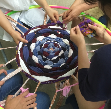 3조로 나눠 헌 옷을 재단하고, 훌라후프를 이용하여 만들거나