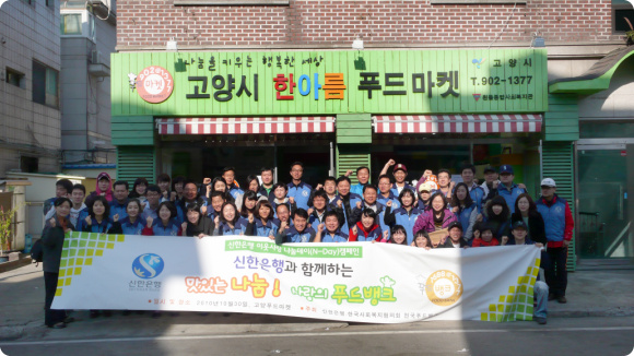 신한은행(행장 이백순) 사회협력팀은 한국사회복지협의회(회장 김득린) 전국푸드뱅크와 함께 저소득 취약계층 겨울나기 지원을 위한 \'신한은행 전국 사랑의 식품꾸러미 행사\'를 전국적으로 12개 지역본부, 경기 지역본부 고양시는 고양시흰돌종합사회복지관 부설 고양시한아름푸드마켓과 함께 10월 30일 개최하였다.