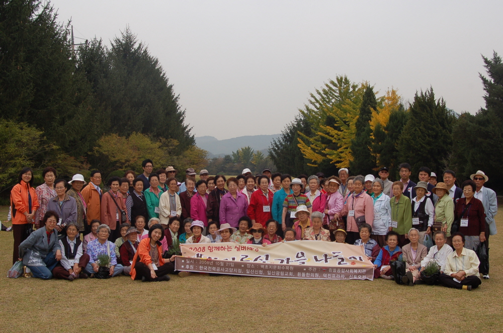 10월 21일 파주 벽초지문화수목원으로 재가 어르신 나들이를 다녀왔다. 나들이에는 90여명의 어르신들이 참여하여 맛있는 식사와 함께 수목원 관람 그리고 몸에 좋은 차만들기란 원예활동을 진행하였으며 참여하신 모든 어르신들에게 기쁨과 즐거운 시간이었다. 특히 이번 재가 어르신나들이에 지역의 한국전력고양지점, 일산신협, 일산광림교회, 흰돌한의원, 덕진프라자에서 후원을 해주셔 더욱 따뜻하고 뜻깊은 나들이가 될수 있었다.