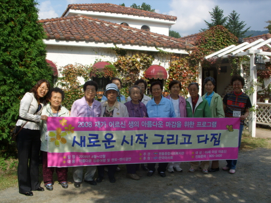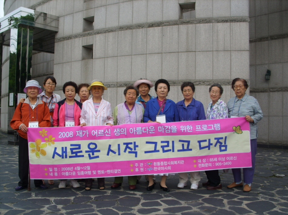 \생의 아름다운 마감을 위한 프로그램 \'새로운 시작 & 다짐\' 아름다운임종여행1- 6회\'추모공원 견학 및 나들이\' 를  1기생은 6월4일, 2기생 10월7일에 실시하였다. 추모공원(납골당, 추모관)에서 관계자의 설명을 통해 화장법, 장례문화을 알고 시설 라운딩을 하였다. 나들이를 통해 담당자와 참여자가 친목도모와 상호관계성을 증진시킴으로써 임종을 보다 긍정적으로 받아들이고 즐거워하는 시간이었다.