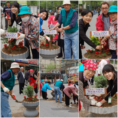 주민들과의 첫모임으로 단지 입구에 화분에 모종 심기를 했어요~