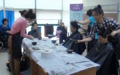 염색서비스를 받는 지역주민의 웃음꽃이 활짝 피었습니다.