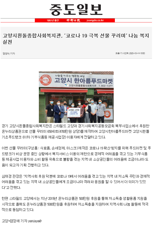 <중도일보 2020.10.14> 고양시흰돌종합사회복지관, '코로나19 극복 선물 꾸러미' 나눔 복지 실천