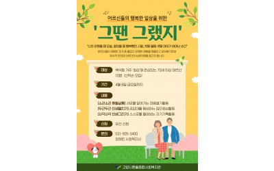 지나온 인생을 회상하며 서로에게 공감하고 지지할 어르신 참여자를 모집합니다!코로나로 인해 서로를 만나지 못하고 집에만 있게 되는 요즘, 어르신들의 정서지지와 추억 도모를 위해만들기 활동, 회상과 관련된 활동, 어르신들의 인생을 담아낸 그림책 만들기 등을 진행하고자 합니다.많은 관심 부탁드립니다 !문의 : 031-905-3400 정채린 사회복지사