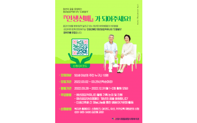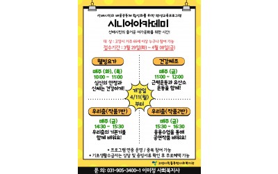 시니어아카데미에서 수강생을 모집합니다. 선배시민의 즐거운 여가문화를 위한 시간!고양시 거주 65세 이상 누구나 참여가능합니다. ^^ 심신의 안정과 신체 건강을 위한 '웰빙요가'근력운동과 유산소 운동을 함께 '건강체조'우리춤의 기본기와 응용까지 "우리춤" 관심있으신 어르신들 연락주시기 바랍니다. 세부적인 사항이 궁금하시…