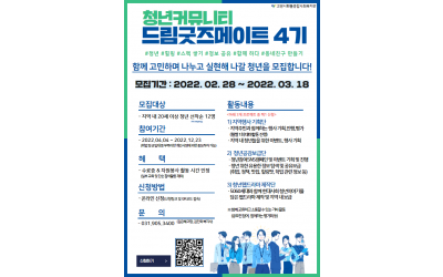 드림굿즈메이트란 ‘꿈(비전)’을 향한 도전을 함께 기획하며 만들어가는 친구(동료)‘ 라는 뜻을 담은 활동명이며, 지역 내 청년들이 함께 모여 직업과 진로에 대한 고민을 나누고, 다양한 경험 활동에 도전하는 청년성장커뮤니티 입니다! 하고 싶은 건 많지만 혼자 하기에는 두려운 청년들!또…