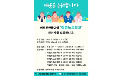 "어르신들의 배움을 응원합니다" 고양시 내 60세 이상 비문해자 대상으로 어르신한글교실 '청춘노트학교' 을 진행합니다. 단계별로 나눠 진행되오니 많은 관심 부탁드려요^^