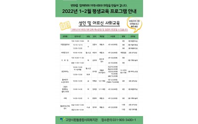 22년 1~2월 평생교육프로그램 안내입니다. 코로나19로 인해 각 강의별로 개강일이 다를 수 있으니 참고하여주시기 바라며궁금한 사항이 있을경우 031-905-3400으로 문의주시기 바랍니다. 감사합니다. ^^