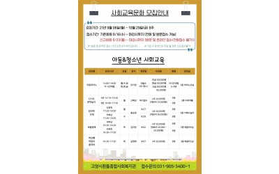 코로나19로 인해 축소운영 및 일정이 각 강의마다 다름을 양해 부탁드리며세부사항 및 궁금점이 있을 경우 사전에 꼭 복지관으로 문의 주시기 바랍니다. 사회교육문화 담당자 이미정 031-905-3400
