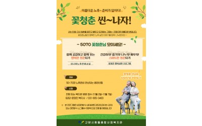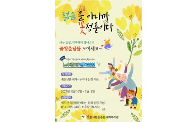 " 젊음을 아니까~ 꽃청춘이다" 우리 꽃청춘님들 사는인생 지루하지 않나요?!# 모집대상: 중장년층(5060세대) 누구나 신청/문의 가능# 모집기간: 2021년 6월 16일 ~ 7월 2일# 진행관련: 대면(소그룹), 참가비 무료~# 신청/문의: 복지관 직접방문 또는 전화신청가능 ( 031-905-3400 / 담당직…