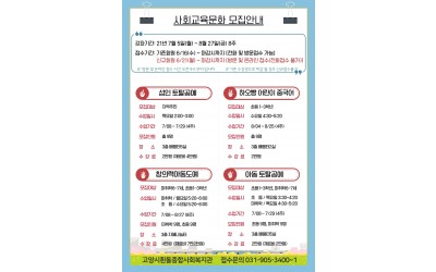 코로나19로 인해 축소운영 및 일정이 각 강의마다 다름을 양해 부탁드리며세부사항 및 궁금점이 있을 경우 복지관으로 문의 주시기 바랍니다. 사회교육문화 담당자 이미정 031-905-3400