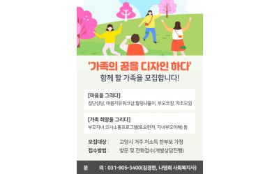 - 활동내용 :[마음을 그리다] 집단상담, 마음치유워크샵,힐링나들이, 부모코칭, 자조모임[가족 희망을 그리다] 부모자녀 의사소통프로그램(토요한끼, 자녀부모이해) 등- 모집대상 : 고양시 거주 저소득 한부모 가정 - 접수방법 : 방문 및 전화접수(개별상담진행)- 문 의 : 031-905-340…