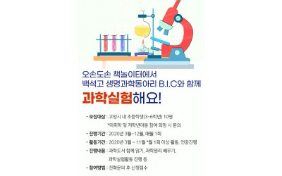 모집대상 : 고양시 내 초등학생(3~6학년) 10명 *미취학 및 저학년아동 참여 희망 시 문의진행기간 : 2020년 3월~12월, 매월 1회진행내용 : 과학도서 함께 읽기, 과학원리 배우기, 과학실험활동 진행 등참여방법 : 전화문의 후 신청접…