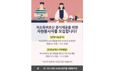 - 활동내용 :[금빛나눔급식]저소득어르신 중식제공을 위한 조리보조 및 뒷정리(평일 9시 30분 ~ 12시 30분) [은빛날개도시락배달]저소득어르신 중식제공을 위한 도시락 도보 배달 (평일 10시 20분 ~ 11시 30분)* 논의 후 날짜 및 시간은 조정 가능…