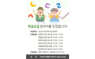 - 모집대상 : 고양시 내 60세 이상 참여자 - 진행내용 : 동백반(기초) 화수금 10:00~12:00 &nb…