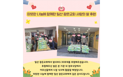 일산 광은교회에서 쌀10KG 30포대를 후원해주셨습니다.추운 겨울 따뜻한 나눔에 함께한 일산 광은교회에게 깊은 감사드립니다 :)