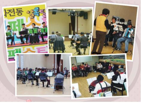 여기까지는 봉사자 채경자 선생님의 글입니다. 선생님께서는 다른 곳에서 봉사를 하시던 중 지인으로부터 흰돌복지관에서 아코디언을 배우고 싶은데 강좌가 없다는 말씀을 듣고 이력서를 준비해 재능봉사를 신청하셨습니다. 처음 우리복지관에 오셔서 한명이라도 좋으니 음악을 사랑하고 배우고 싶은 열정이 있으신 분을 위해 봉사하시겠다며 연락을 바란다고 말씀하시곤 꼭 하고 싶다고 강조하셨습니다. 마침 1인1악기 시대에 맞춰 악기연주를 하고 싶다며 아코디언 연주반 개설을 제안하신 회원님 덕분에 2011년 3월 한명의 수강생으로 출발하여 현재 선생님의 지도를 받는 수강생이 40명을 넘어섰습니다. 이분들 또한 비가 오나 눈이 오나 한 번도 빠지지 않고 따뜻한 마음으로 지도해 주시는 강사님의 뜻을 이어 자원봉사 동아리가 형성되어 현재 한 달에 두 번 정도 양로원에 연주봉사 활동을 하시며 가슴 따뜻한 이야기를 나누어 주십니다. 또한 지역 내 행사에 참여하여 연주봉사를 즐기시며 지역주민의 소통의 장을 열어주시곤 합니다. 나눔은 이렇게 서로의 가슴과 가슴이 통하는 짜릿함을, 마음과 마음을 이어주는 뭉클함을 다른 모든이에게 전달하는 힘이 있음을 담당사회복지사는 느낄 수 있었습니다. 행복바이러스는 우리 곁에 항상 존재하고 있습니다. 언제 어떻게 전파하느냐는 각자의 몫이라 생각됩니다. 소중한 시간과 따뜻한 마음을 나눌 줄 아는 멋진 사람들을 사랑합니다 ~^^