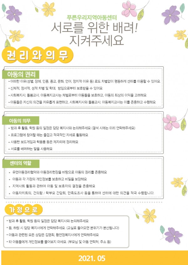 푸른우리지역아동센터에서는 아동 이익과 권리를 최우선하기 위하여 다음과 같이 아동권리규정을 시행 및 안내하고 있습니다.