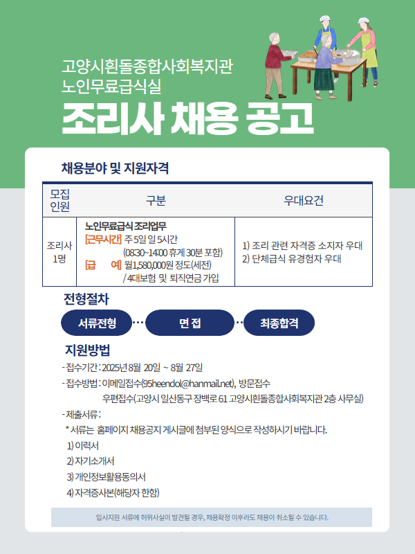 고양시흰돌종합사회복지관에서는 노인무료급식실 조리사를 아래와 같이 채용하고자 하오니 역량 있는 분들의 많은 관심 바랍니다.