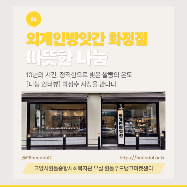![[나눔인터뷰] 10년의 정직함으로 빚은 쌀빵의 온도, ‘외계인방앗간 화정점’ 박성수 사장님을 만나다 > 포토갤러리](https://heendol.or.kr/img/logo.png)