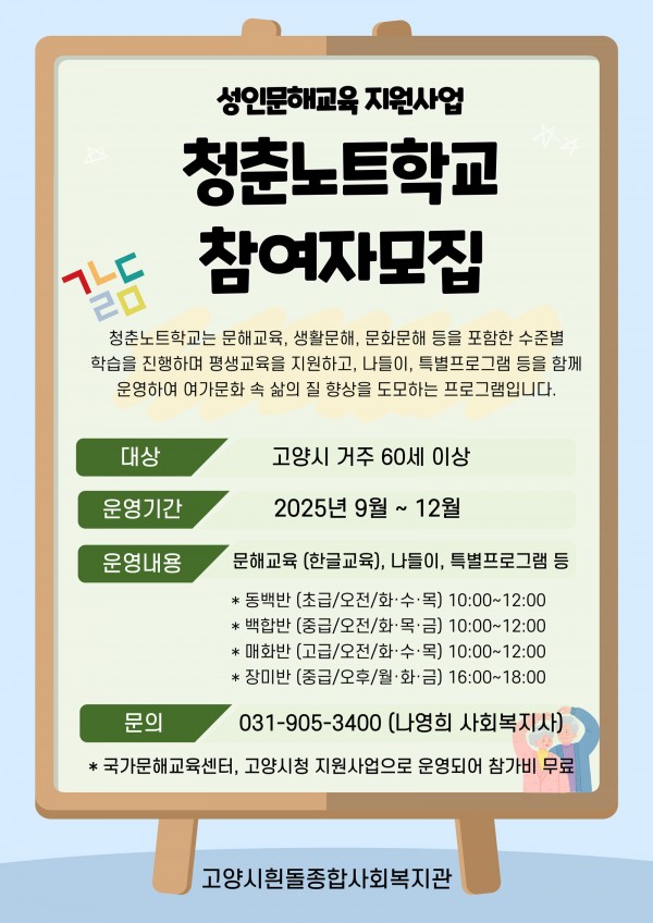 운영내용 : 문해교육 (한글교육), 나들이, 백일장, 특별프로그램 등